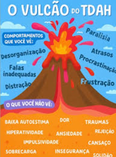 Se entendermos o TDAH como um “vulcão”, na superfície vemos os comportamentos que “explodem” — a desorganização, a procrastinação, a frustração. Mas por dentro, no que não se vê, há dor, ansiedade, baixa autoestima, insegurança e cansaço. Tudo isso se acumula até o momento em que transborda. E é nesse ponto que o acolhimento faz toda a diferença: em vez de apagar o fogo, o ideal é entender o que o alimenta.